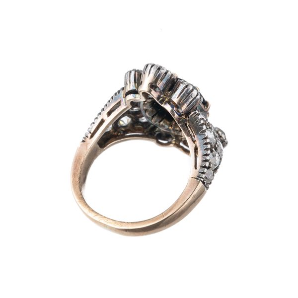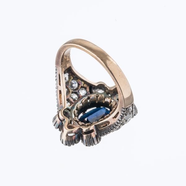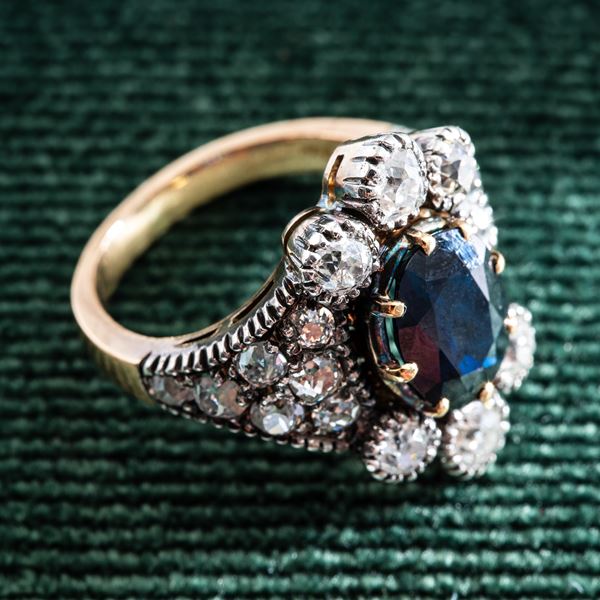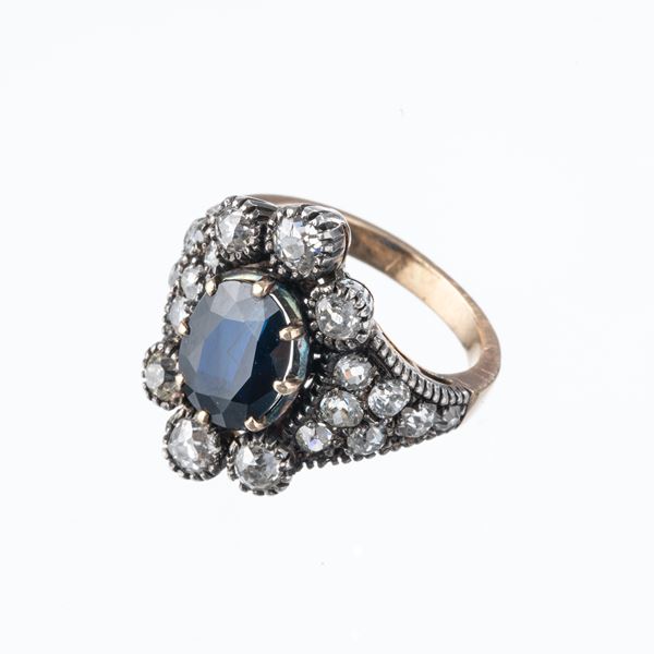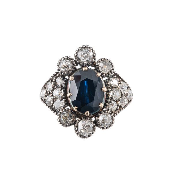 ANELLO IN ORO GIALLO 18KT E ARGENTO CON ZAFFIRO E DIAMANTI CORONE'