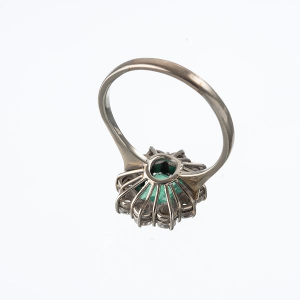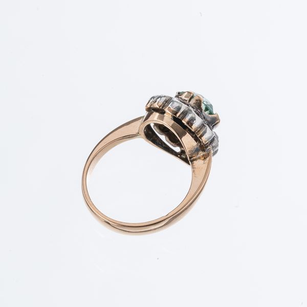 ANELLO IN ORO ROSA 18 kt E ARGENTO CON PIETRA VERDE CENTRALE SINTETICA E CONTORNO DI ROSETTE DI DIAMANTE