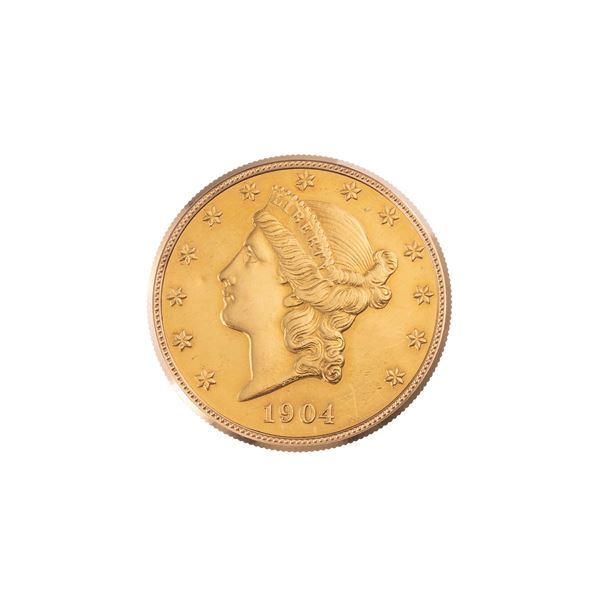 Note: Orologio 'coin watch' Twenty Dollars in oro giallo 18kt. Quadrante bianco, indici romani ad ore tre, sei, nove, dodici. Sfere a bastone nere. Vetro minerale piatto.