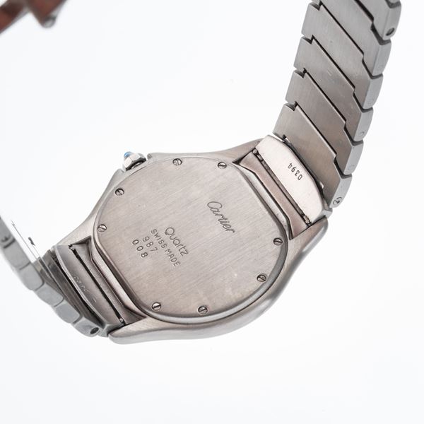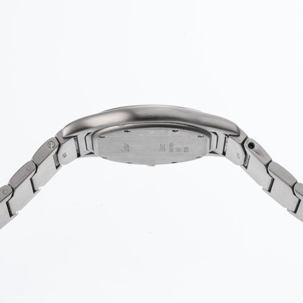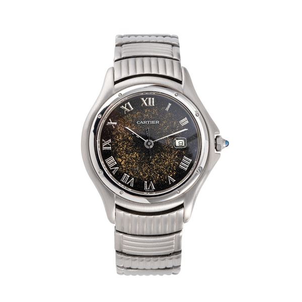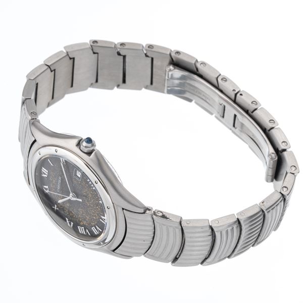 Note: Orologio in acciaio al quarzo con datario ad ore tre. Quadrante tropicale, indici romani e sfere a gladio in acciaio. Corona con cabochon. Vetro minerale bombato.