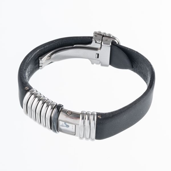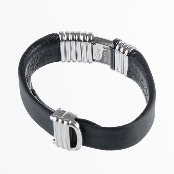 Note: Orologio bracciale con cassa in acciaio e titanio, con quattro diamanti nella parte superiore della cassa. Cinturino in tessuto e deployante in acciaio Cartier. Quadrante grigio soleil, sfere a gladio anodizzate blu. Vetro minerale piatto.