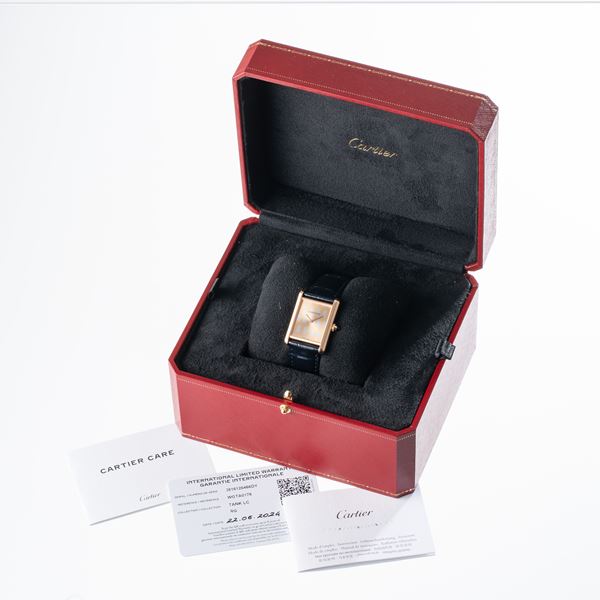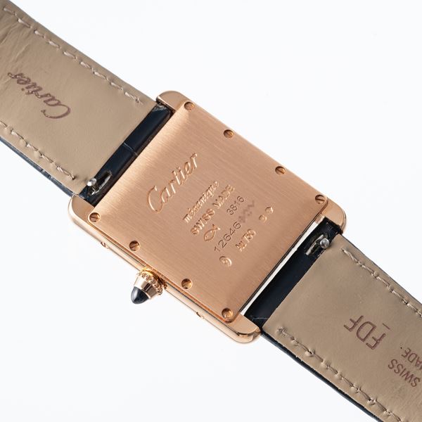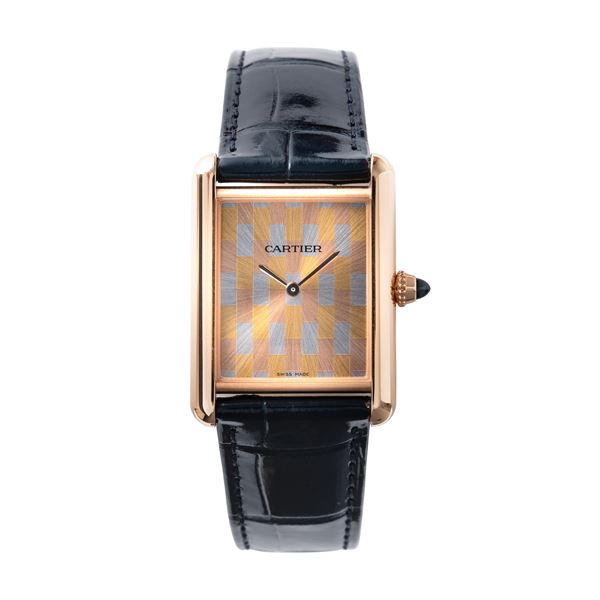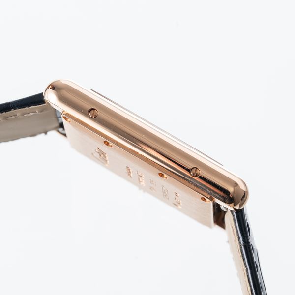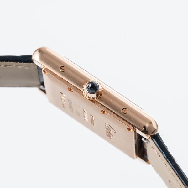Note: Orologio in oro rosa 18kt a carica manuale, quadrante 'Tre Ori'. Vetro minerale bombato, sfere a gladio in oro rosa, corona in oro rosa con cabochon blu. Cinturino e fibbia in oro rosa 18kt Cartier.