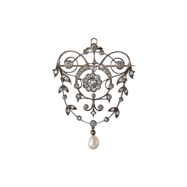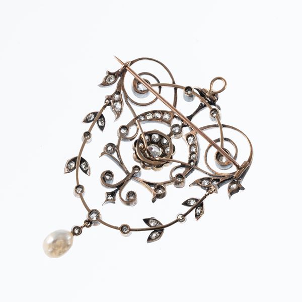 CIONDOLO/SPILLA IN ORO 18 KT E ARGENTO CON DIAMANTI TAGLIO ANTICO e PERLA PENDENTE. SNODATO TRAFORATO CON ELEMENTI FLOREALI.