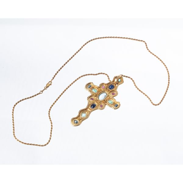 CROCE IN ORO GIALLO 18KT CON TECNICA A SBALZO RUBINI, SMERALDI, ZAFFIRI, TOPAZIO AZZURRO CON CATENA
