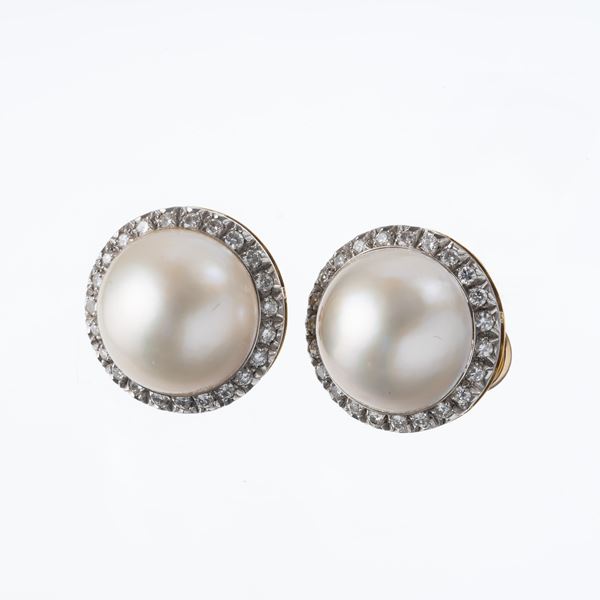 Note: Orecchini in oro giallo 18 kt con perle mabé 17 mm e contorno diamanti colore H per CT 1.50
