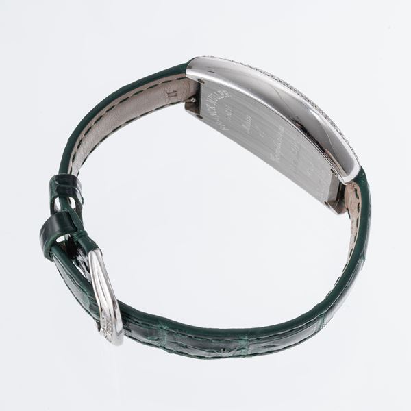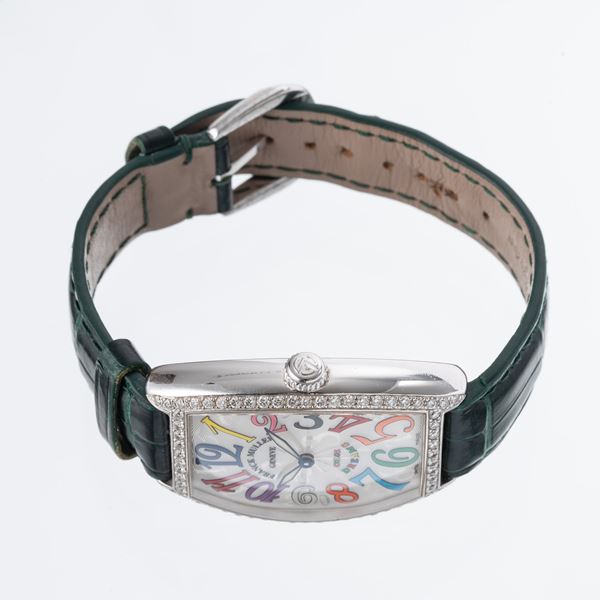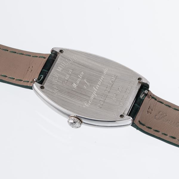 Note: Orologio al quarzo con cassa a cuscino in acciaio. Ghiera in diamanti. Quadrante argenté guilloche. Indici arabi multicolor. Sfere a gladio luminescenti. Vetro minerale bombato. Cinturino in pelle e fibbia Frank Muller in acciaio e diamanti.