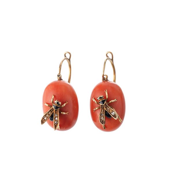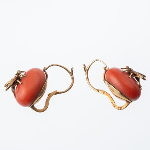 Note: Orecchini in oro giallo 18kt con apine in oro giallo 18kt adagiate su due spole di corallo a confetto.