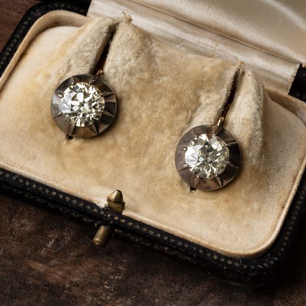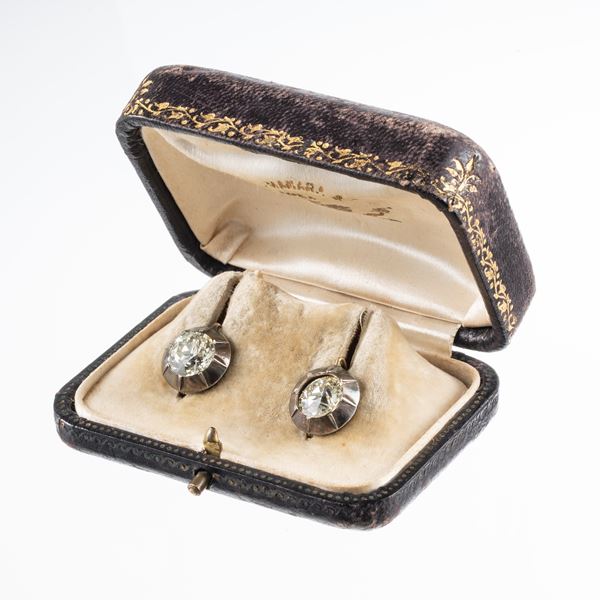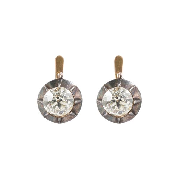 ORECCHINI IN ORO 18KT E ARGENTO CON DUE DIAMANTI TAGLIO ROTONDO VECCHIO EUROPEO