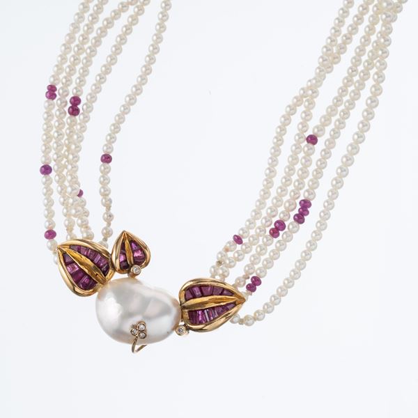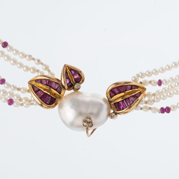 Note: Girocollo in perline coltivate da 2.5/3 mm con chiusura con perla barocca 24.10ct e rubini 4.20ct