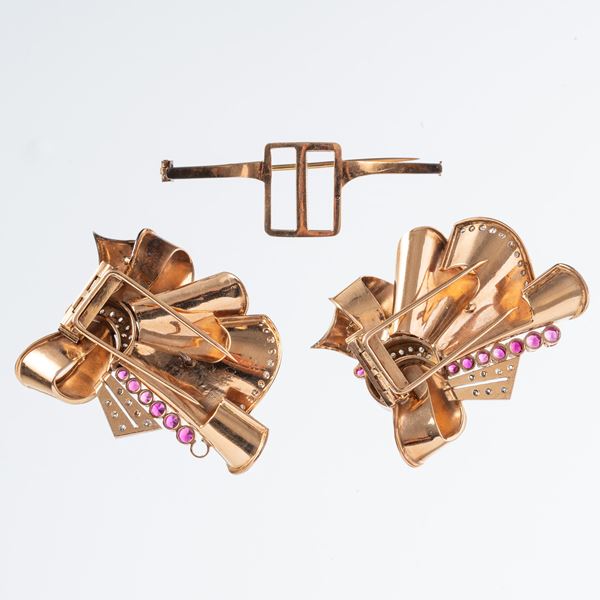 SPILLA IN 3 ELEMENTI IN ORO ROSA 18 KT CON PIETRE ROSSE E BRILLANTINI