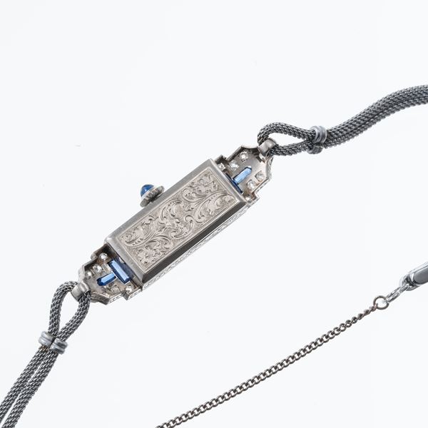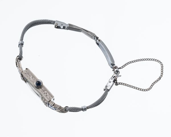 Note: Orologio a carica manuale in oro bianco 18kt con cassa lavorata con pietre. Indici romani ad ore due, quattro, sei, otto, dieci e dodici. Lunghezza totale 125 mm, clasp elastica. Vetro minerale bombato, corona con cabochon.