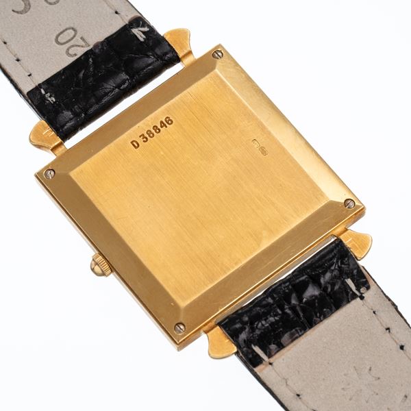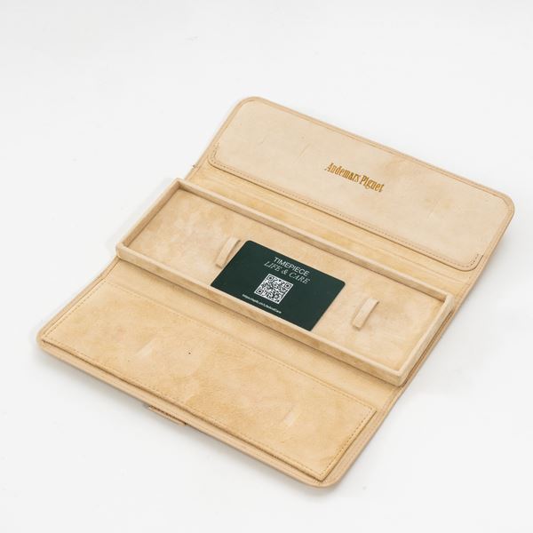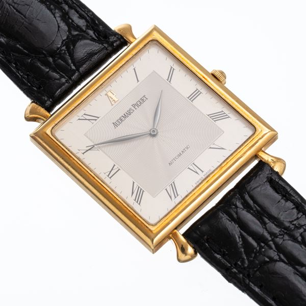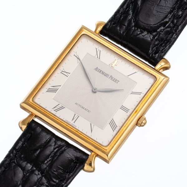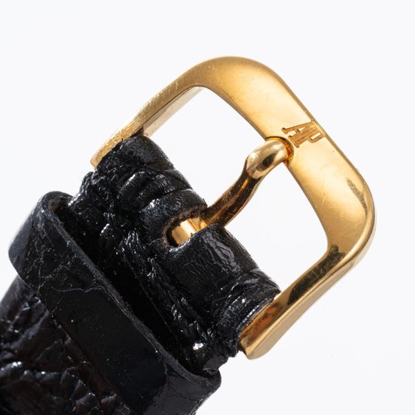 Notes: 18kt yellow gold self-winding watch. Guilloché Two tone dial. Black Roman indexes. Black leaf spheres. Buckle in 18kt yellow gold Audemars Piguet.Flat mineral glass.