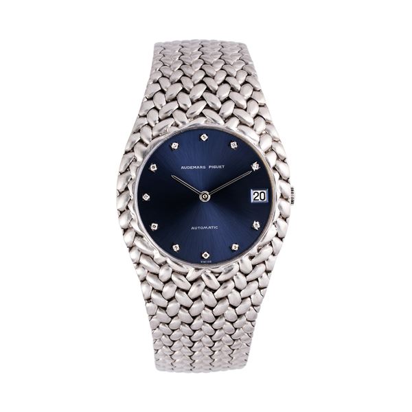 18KT WHITE GOLD AUTOMATIC WINDING WATCH WITH INTEGRATED 18KT WHITE GOLD BRACELET, BLUE DIAL WITH BRILLIANT-CUT DIAMOND HOUR MARKERS AND DATE WINDOW AT THREE O'CLOCK.