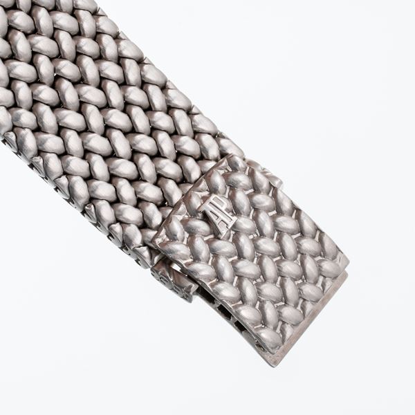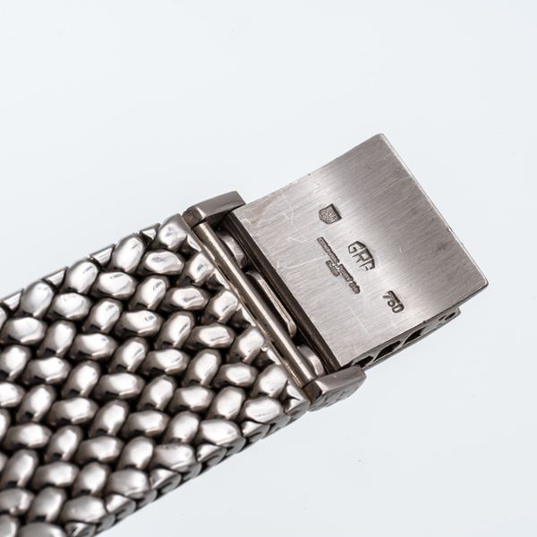 Notes: 18kt white gold self-winding watch with 18kt white gold Gilbert Gaschen integrated bracelet. Blue dial, brilliant-cut diamond hour markers, 18kt white gold baton spheres, date window at three o'clock. 18kt white gold screw-down case back. Flat mineral crystal.