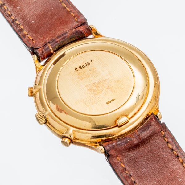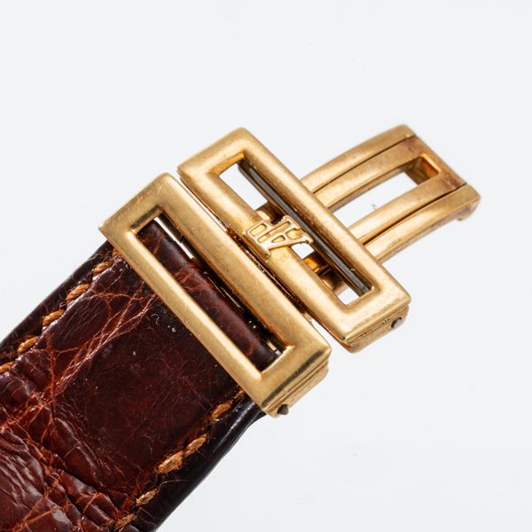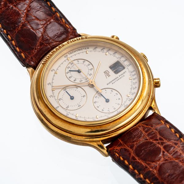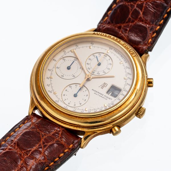Notes: 18kt yellow gold self-winding chronograph. Silver-plated dial with date window at 3 o'clock. 18kt yellow gold baton hour markers and spheres. Tachymeter scale with black Arabic numerals. Counters with blue burnished baton spheres. Leather strap, 18kt yellow gold Audemars Piguet deployant. Flat mineral crystal, snap-in case back.