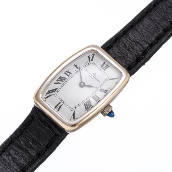 Notes: Manual winding watch in 18kt white gold. White dial with black Roman hour markers. Blue burnished hands. Crown with blue cabochon. Curved mineral crystal.