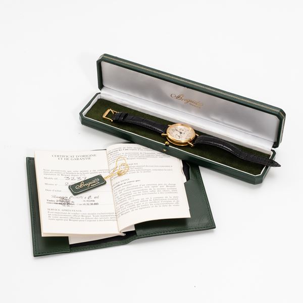 Notes: 18kt Yellow Gold Chronograph. Grey and white bitonal dial, honeycomb central part. Black Roman hour markers. Blue burnished Breguet hands. Breguet leather strap, Breguet 18kt yellow gold buckle. Flat mineral crystal. Push-in crown. Screw-down case back.