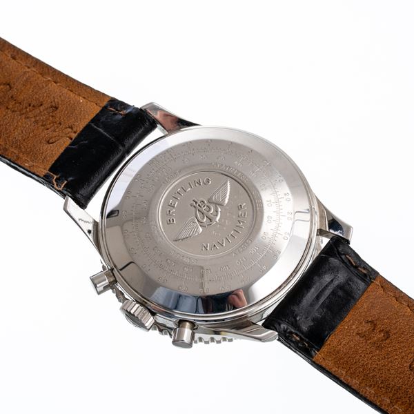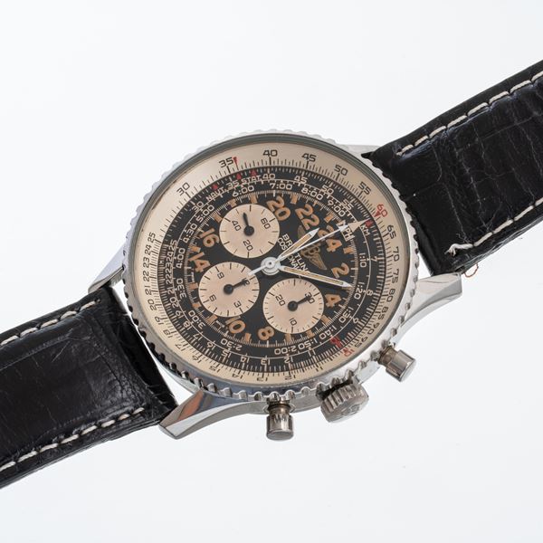 Notes: Manual winding steel chronograph with 24-hour dial. Dial with luminescent Arabic hour markers, white baton spheres with luminescent material.Leather strap, Breitling steel buckle Bidirectional bezel. Flat mineral crystal. Press-in case back.