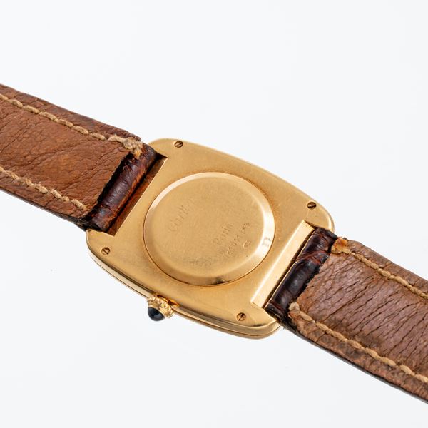 Notes: Manual winding watch in 18kt yellow gold. White dial, black Roman hour markers, blue burnished gladius spheres. Crown with blue cabochon. Leather strap, Cartier buckle. Domed mineral crystal.