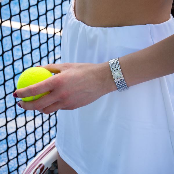 Notes: 18kt white gold quartz watch. Mother of pearl dial. Bezel brilliant-cut diamonds. Gladius spheres. Cartier integrated bracelet in 18kt white gold. Flat mineral crystal