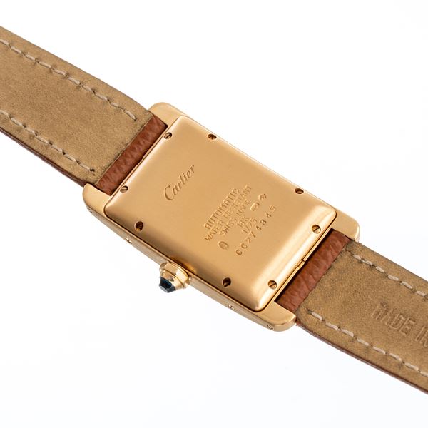 Notes: 18kt yellow gold self-winding watch. Gillochรฉ white dial, black Roman indices, blue brunite gladio balls. Central seconds, date at six o'clock. Crown with blue cabochons. Leather strap, gold Cartier buckle. Curved mineral glass.
