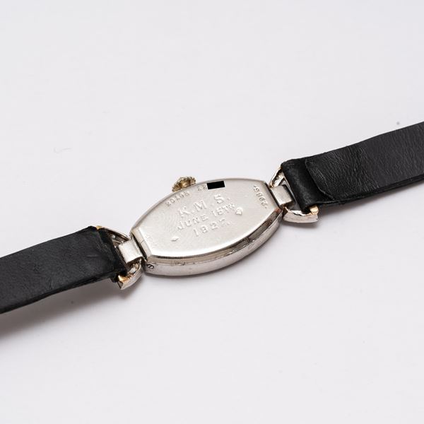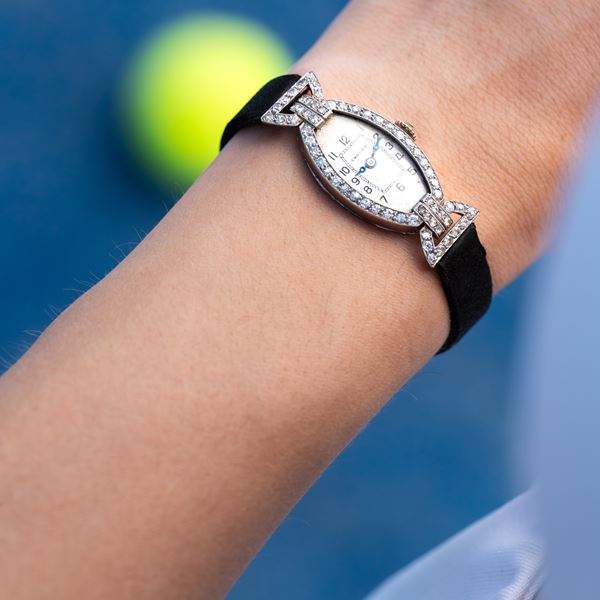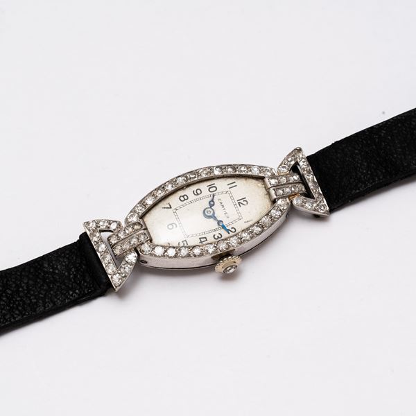 Notes: Manual winding watch in platinum. White dial, black Roman hour markers. Blue burnished Breguet hands. Domed mineral glass. Case back with engraving.