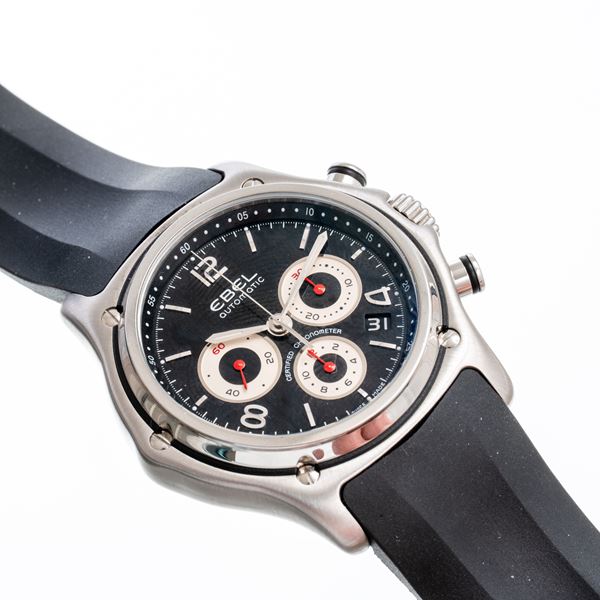 Notes: Steel automatic winding chronograph. Black dial, date window at four o'clock, baton hour markers, Arabic numerals at four, eight, twelve o'clock. Gladius hands with luminescent material. Seconds counter at nine o'clock, minutes at three o'clock, hours at nine o'clock. White counters with red baton spheres. Ebel rubber strap, Ebel steel deployant. Exposed case back. Domed plexi glass.