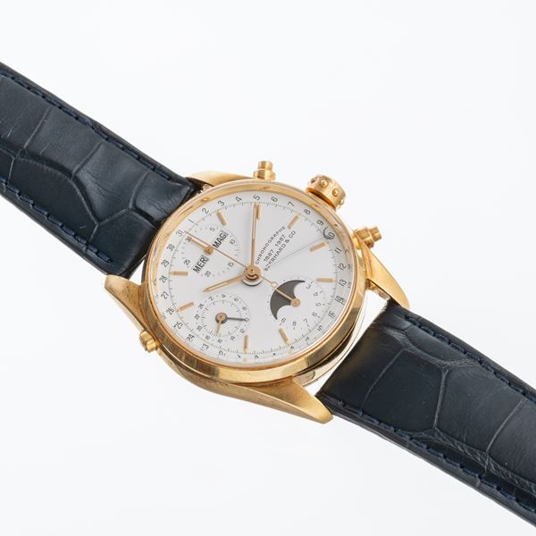 Notes: 18kt yellow gold automatic watch, leather strap, Eberhard buckle. White dial, gold baton hour markers, gold baton spheres with luminescent material. Double day-month window at twelve o'clock, moon phases at six o'clock, seconds and 24-hour counter at nine o'clock. Chronograph counters at six and twelve o'clock. Date pointer ball with blue half moon. Domed plexi glass.