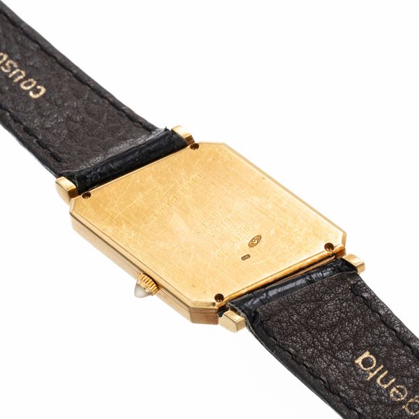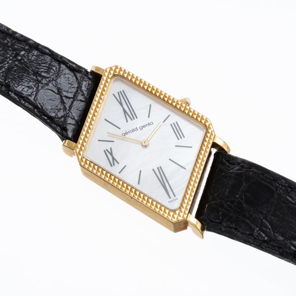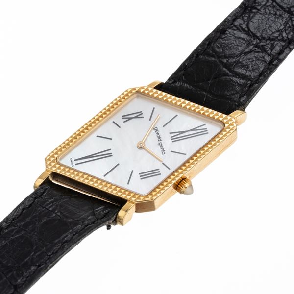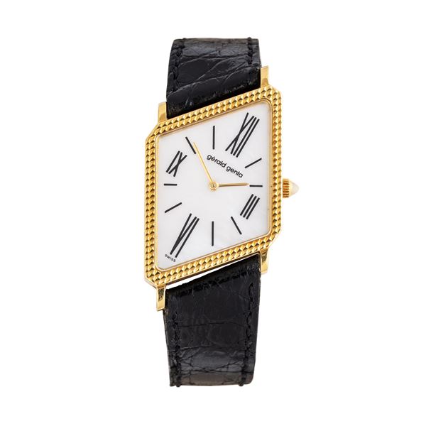 Notes: Manual winding watch with asymmetrical yellow gold case and 'clous de Paris' bezel. Mother-of-pearl dial, Roman hour markers at three, six, nine, twelve and baton. Yellow gold baton-shaped hands. Gold crown with mother-of-pearl cabochon. Gerald Genta leather strap and 18kt yellow gold “clous de Paris” buckle. Flat mineral crystal