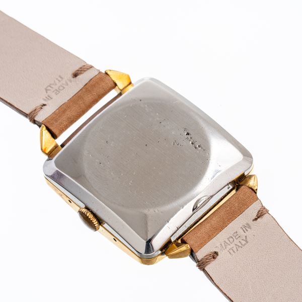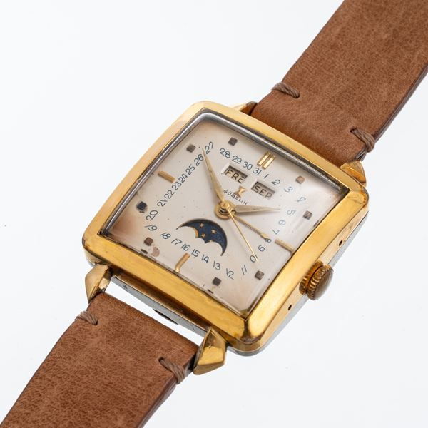 Notes: Automatic winding watch with steel back and chrome carure. White dial, double window at twelve o'clock for day and month, pointer date display, gold-colored mixed hour markers, gold-colored dauphine spheres. Moon phase at six o'clock. Central seconds. Domed plexi crystal.