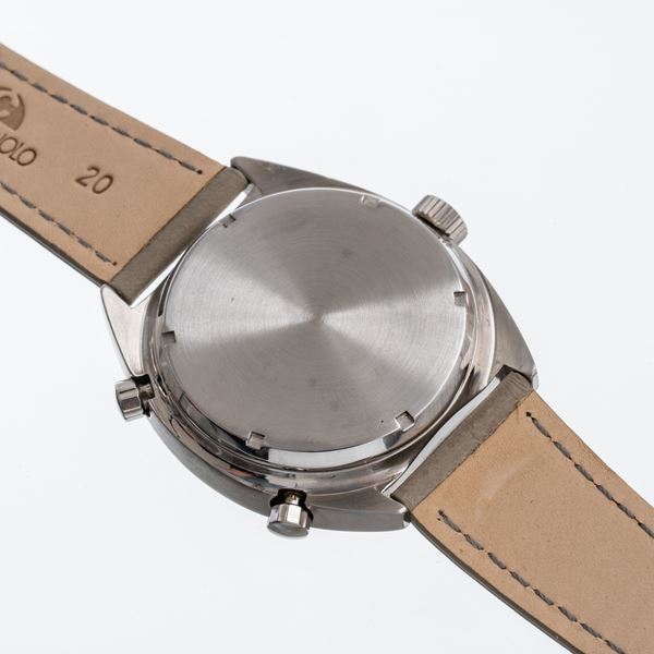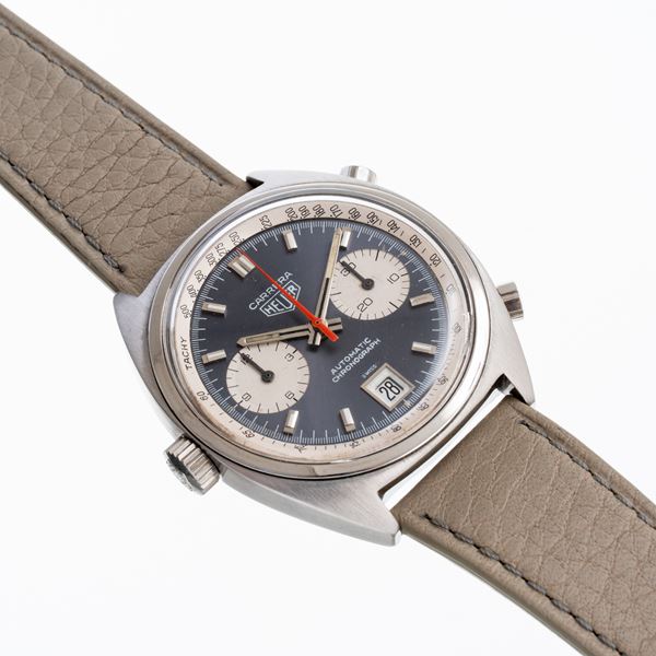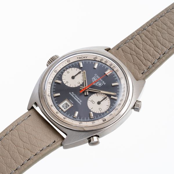 AUTOMATIC CHRONOGRAPH WITH CROWN AT NINE O'CLOCK, BLUE DIAL AND DATE WINDOW AT SIX O'CLOCK.