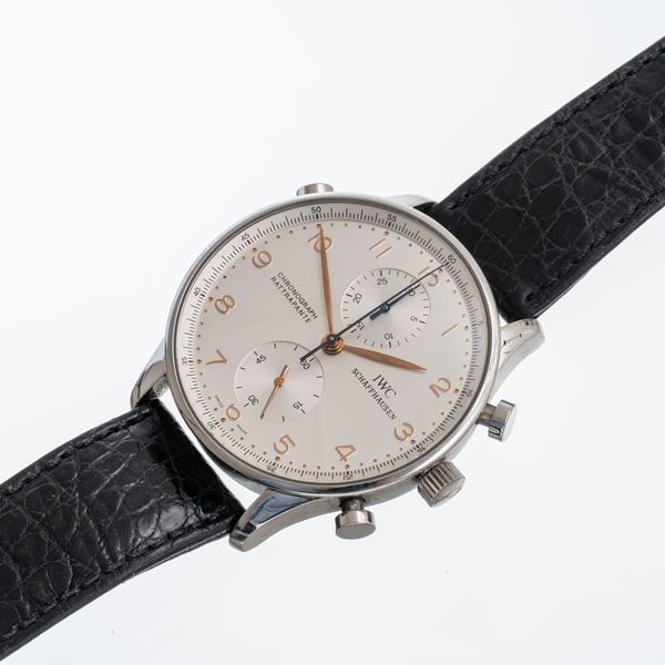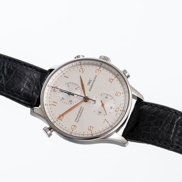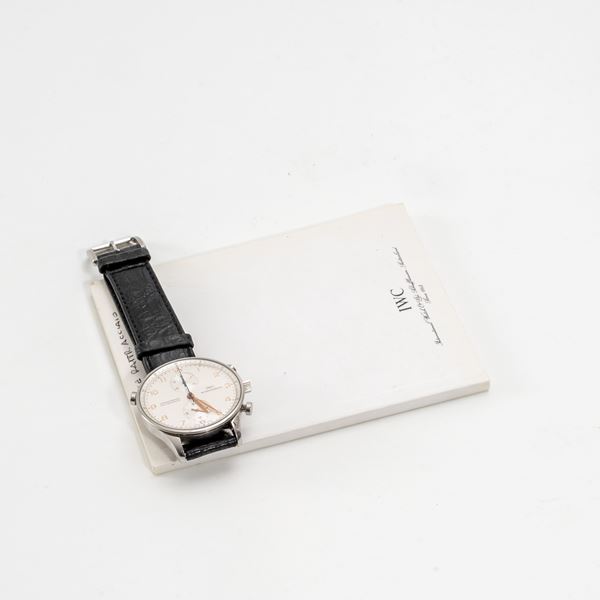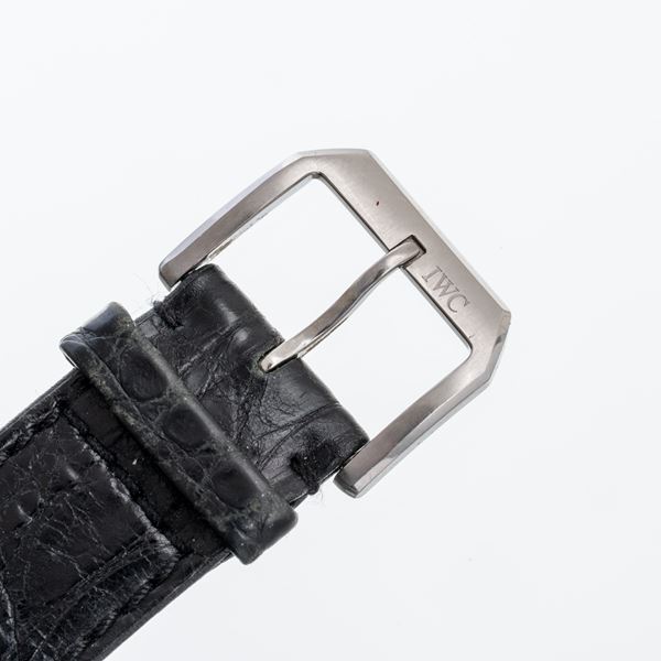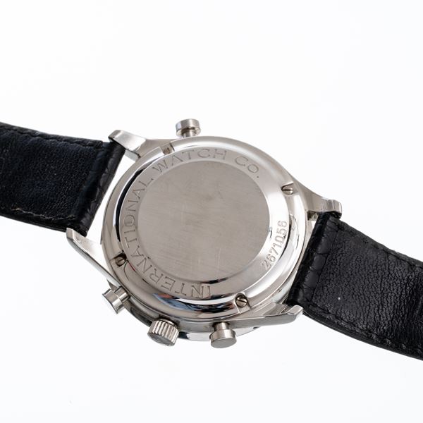 Notes: Manual winding steel ratcheting chronograph. Silver dial. Golden Arabic indexes, gold leaf balls. Blue burnished minute counter and chronograph balls. IWC leather strap, IWC steel buckle. Pressure crown. Domed mineral glass.