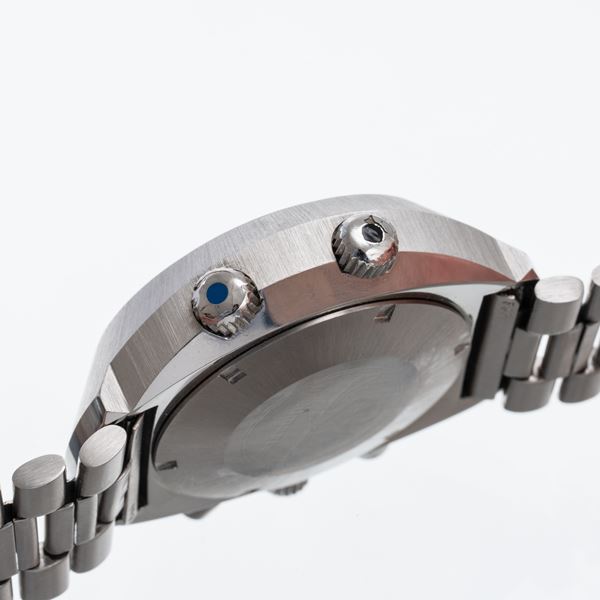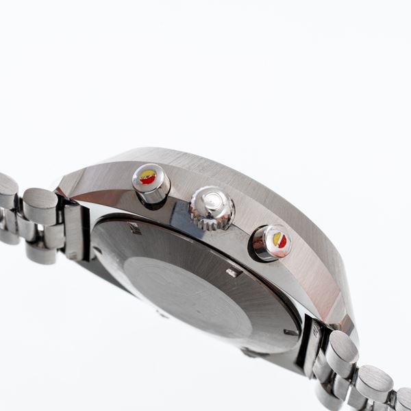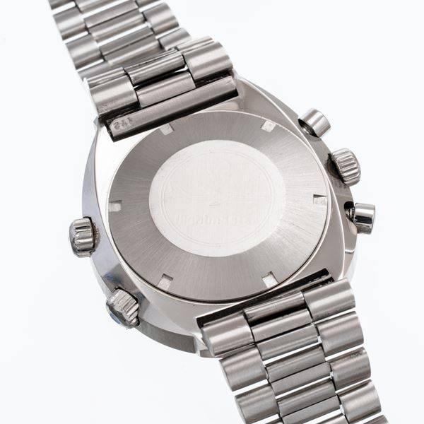 Notes: Steel manual winding chronograph. Grey dial, hour markers and stick balls. Orange chronograph balls, blue GMT ball. Bidirectional dial with Arabic indices. Winding crown at three o'clock, dial adjustment crown at eight o'clock and GMT adjustment crown at ten o'clock. mineral glass. Pressure crown, screw steel back.