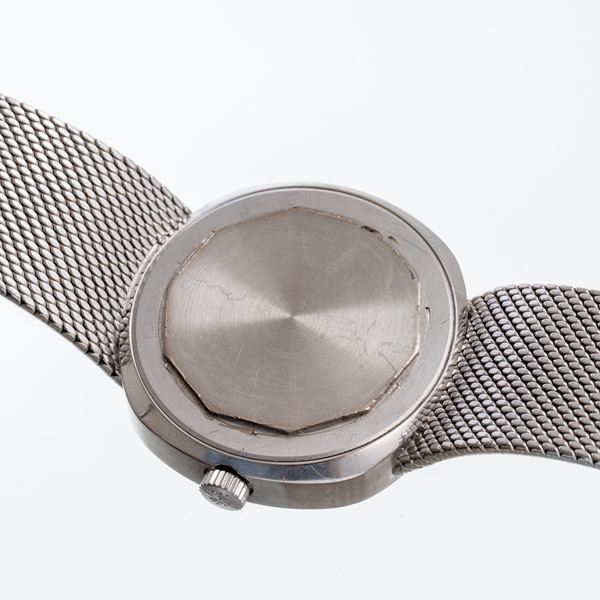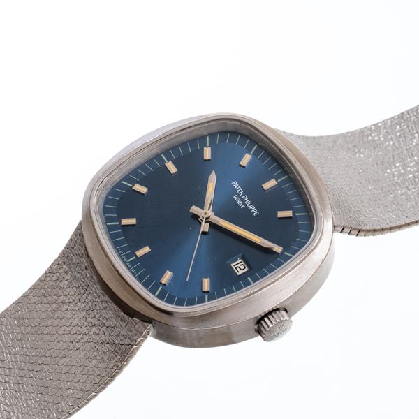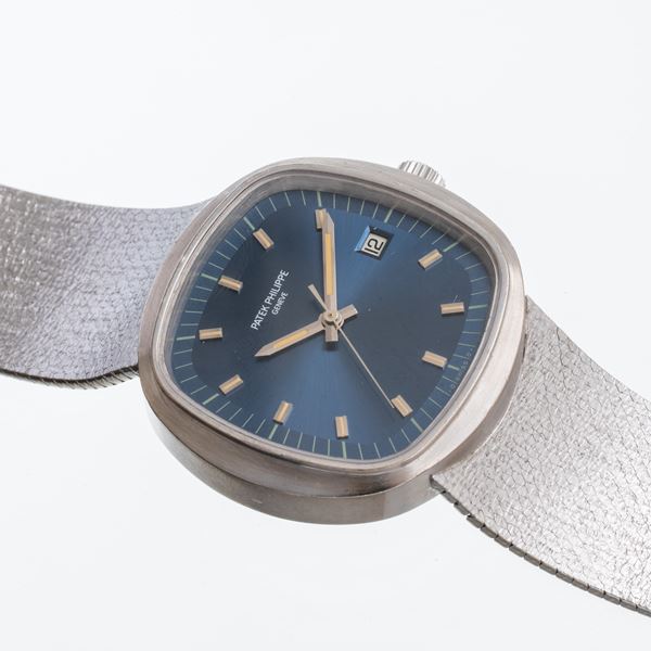 Notes: 8kt white gold quartz watch with integrated 18kt white gold bracelet. Blue sigma dial, 18kt white gold baton hour markers and spheres with luminescent material. Date window at 3 o'clock. Flat mineral crystal. 18kt white gold screw-down case back.