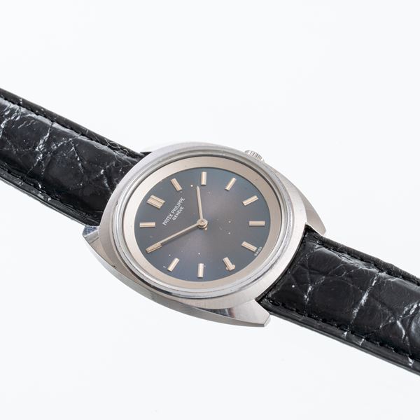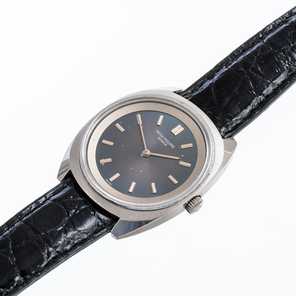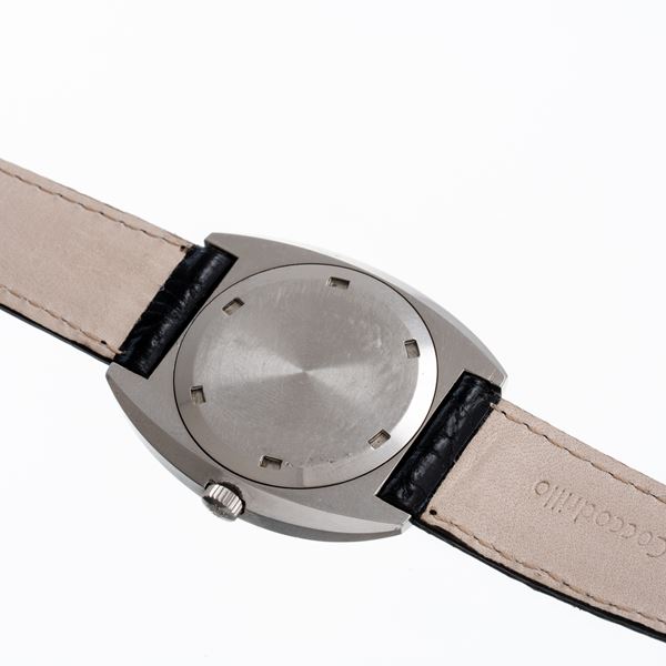 Notes: Steel manual winding watch. Blue dial, baton spheres, baton hour markers. Flat mineral glass. Steel screw-down case back.