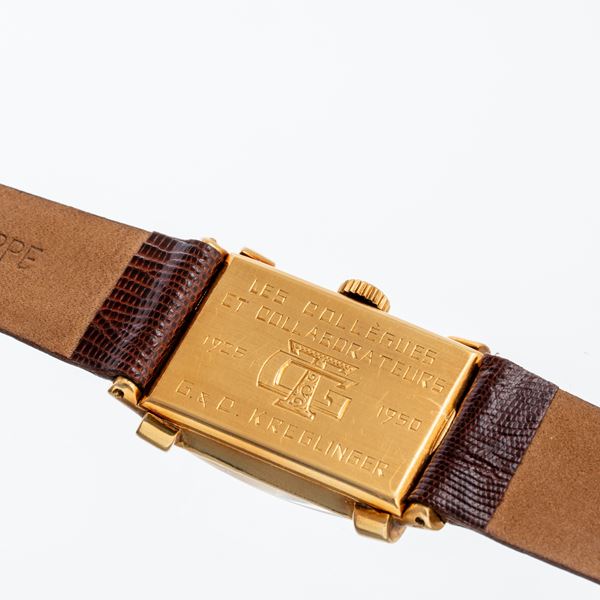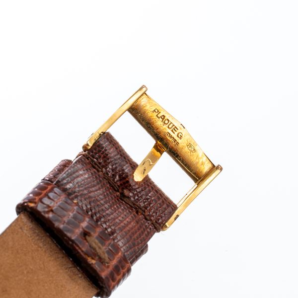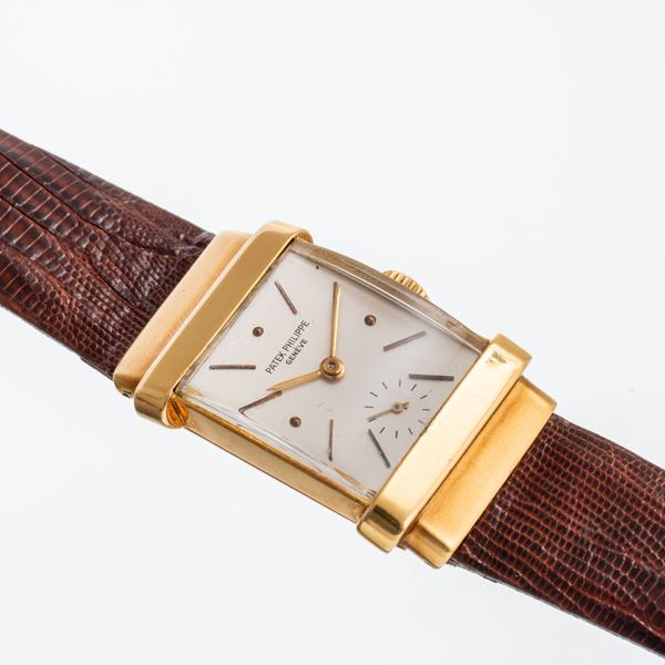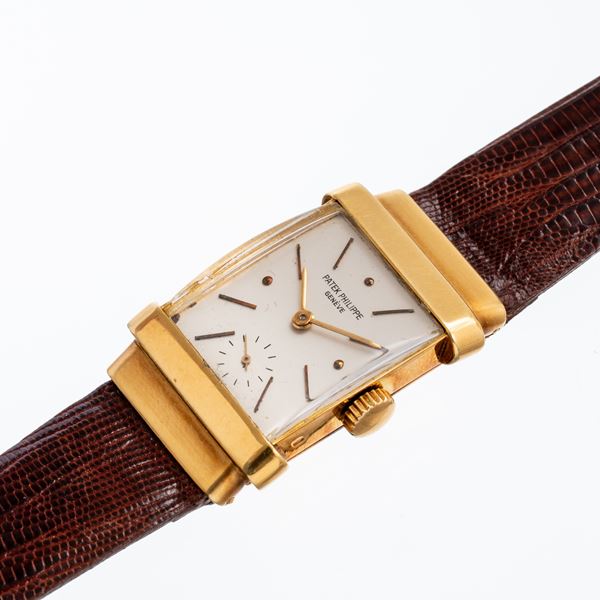 Notes: Manual winding watch in 18kt yellow gold. Silver dial, indexes and golden stick balls. Small seconds at six o'clock. Leather strap, gold-plated Patek Philippe buckle. 18kt yellow gold pressure case with dedication. Mineral glass.