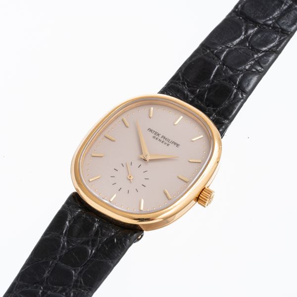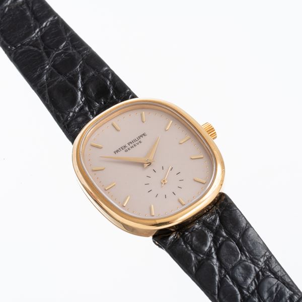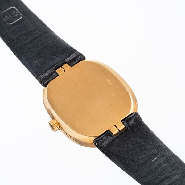 Notes: Manual winding watch in 18kt yellow gold. Ivory sigma dial. Small seconds at 6 o'clock. 18kt yellow gold baton hour markers and dauphine spheres. Flat mineral crystal.