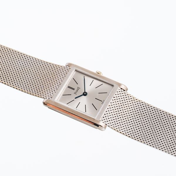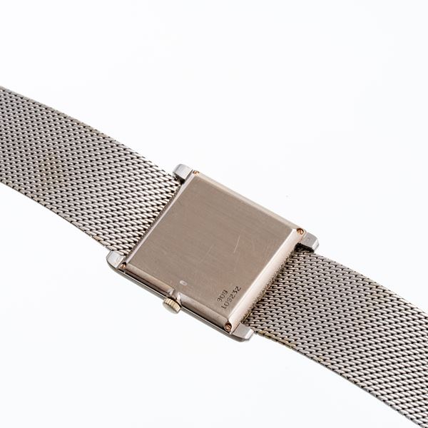 Notes: Wristwatch with manual winding. Case in 18kt white gold, integrated bracelet in 18kt white gold. Grey dial, black baton hour markers, blue burnished baton spheres. Flat mineral crystal.