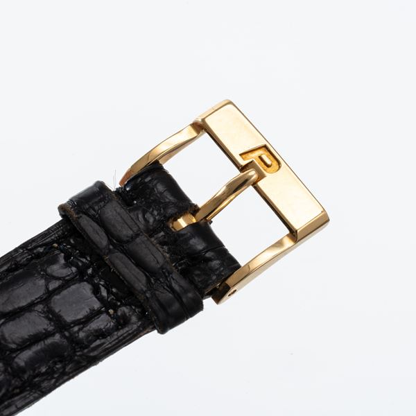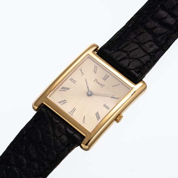 Notes: Manual winding watch in 18kt yellow gold. Curved case. Champagne dial, black Roman hour markers, black baton spheres. Curved mineral crystal. Leather strap, 18kt yellow gold Piaget buckle.