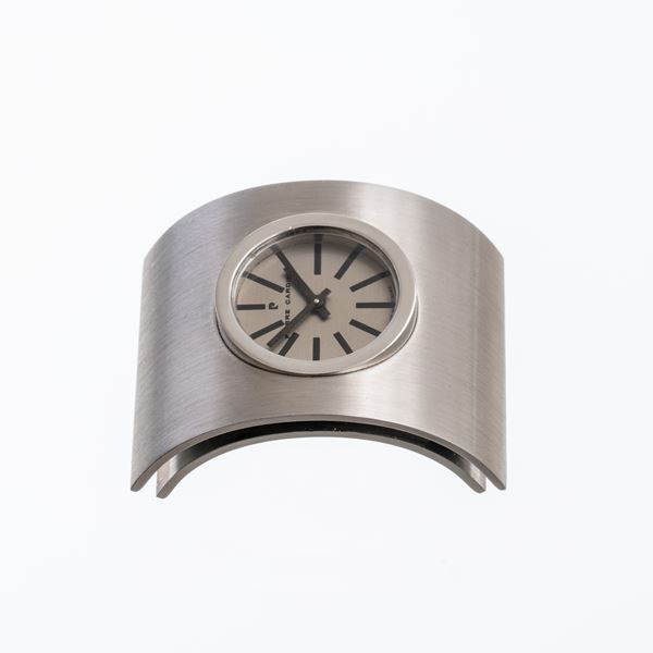 Notes: Watch from 'The Space Age' collection, designed by designer Pierre Cardin. Watch with curved case to be worn on the inside of the wrist, designed for pilots. Steel case, gray dial, stick hour markers and hands. Flat mineral crystal.