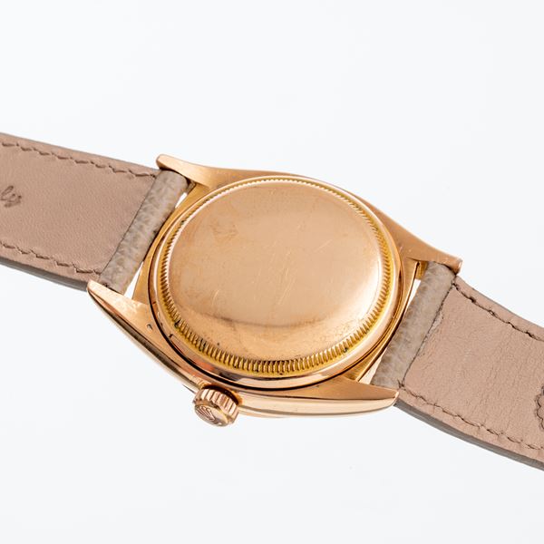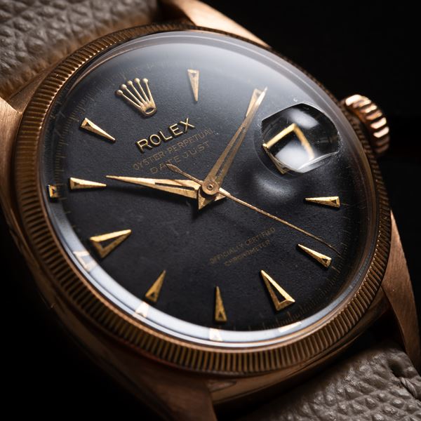 Notes: 18kt rose gold watch. Black gold graphic dial, date window at three o'clock with roulette date window. Gold dauphine hands with luminescent material. Domed Plexiglas crystal, screw-down case back.