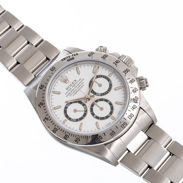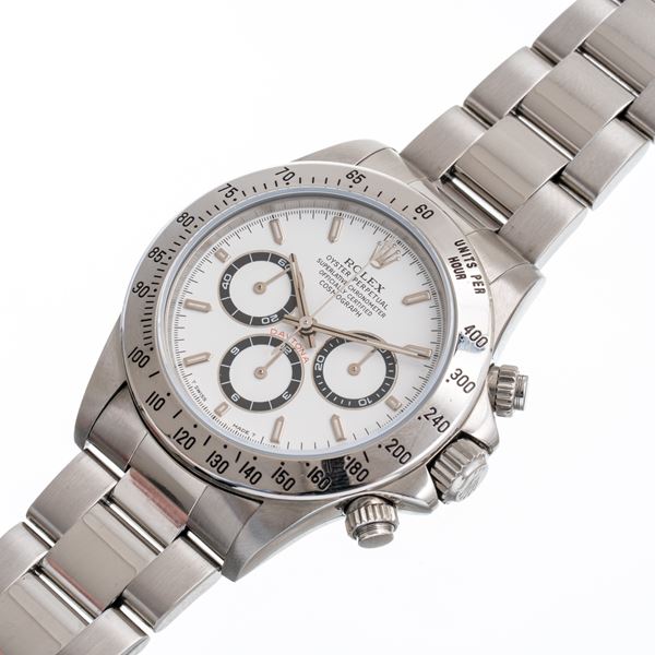 Notes: Automatic winding steel chronograph, steel case. White dial, black chronograph counters with white interior. Baton hands with luminescent material, baton hour markers with luminescent material. Bezel with steel tachymeter scale. Flat mineral crystal. Screw-down case back.