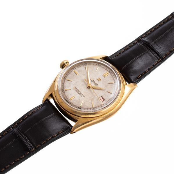 Notes: 18kt yellow gold watch with automatic winding. White dial, gold stick indexes, gold leaf balls. Date roulette at three o'clock. Crown at nine o'clock. Domed plexiglass, screw case in 18kt yellow gold.