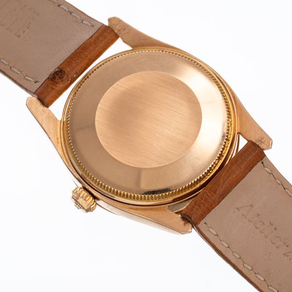 Notes: Automatic winding watch in 18kt rose gold. Honeycomb dial, dauphine spheres with luminescent material. Leather strap, gold-plated Rolex buckle. Domed plexi glass. 18kt yellow gold case back.