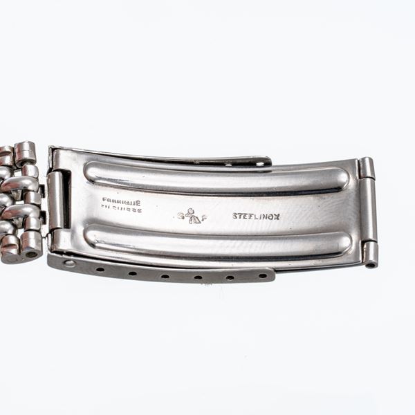 Note: Clock time only automatic winding with small seconds at six o'clock. Silvery dial, black Roman indexes at two, four, six, eight, ten, twelve. Blue brunite cathedrals. Bracelet rice beans Gay FrΓ©res. Steel pressure case. Curved plexi glass.