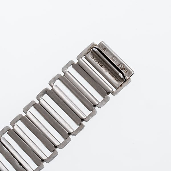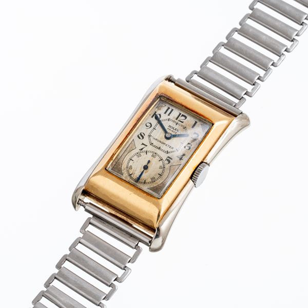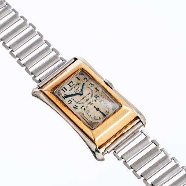 Notes: Manual winding watch with 18kt yellow gold and 18kt white gold case. Small seconds at 6 o'clock. Grey bitonal dial. Black 'art deco' hour markers, blue burnished baton spheres. Gay Frères steel bonklip bracelet. Curved mineral crystal. 18kt yellow gold push caseback.