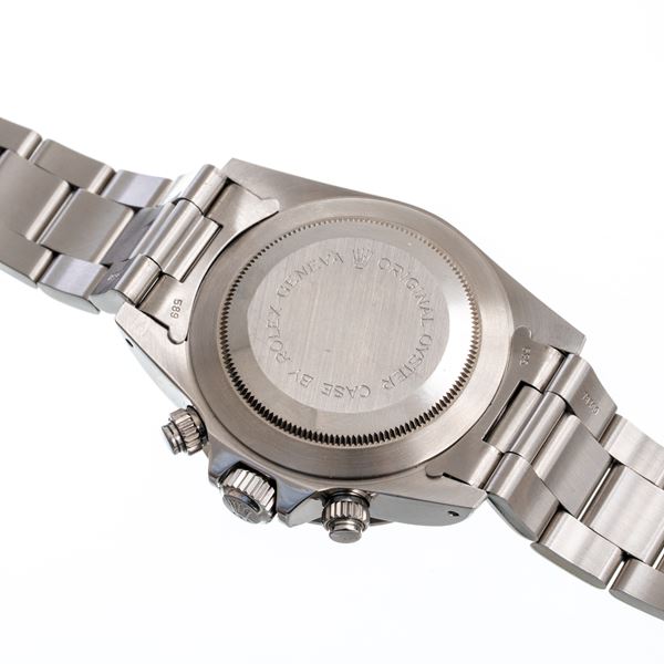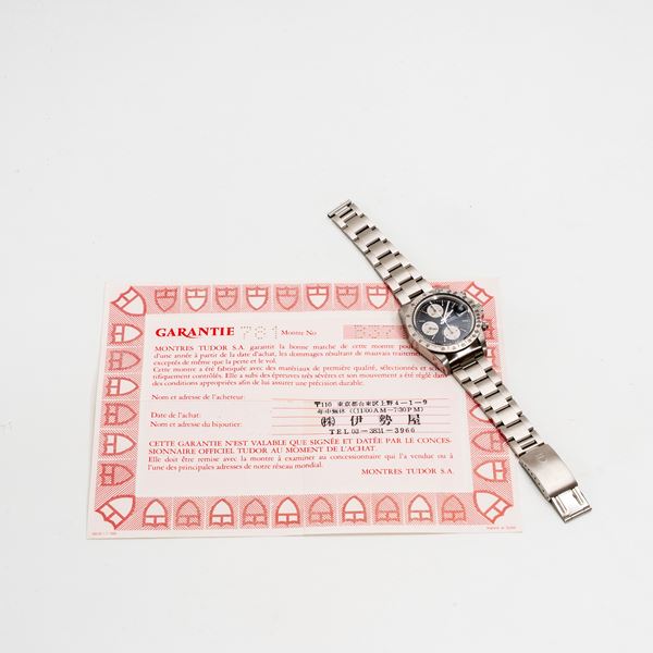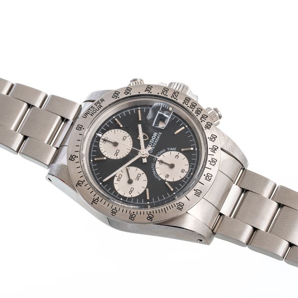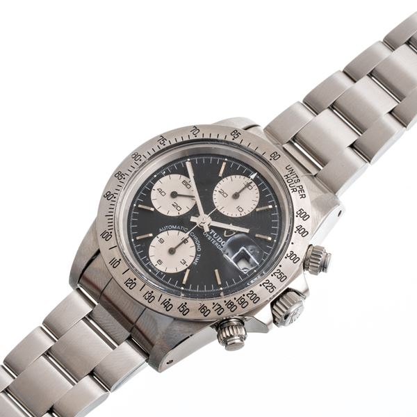 Notes: Steel automatic winding chronograph with grey dial. Hour markers and baton spheres with luminescent material. Date window at three o'clock. Seconds counter at nine o'clock, minutes at twelve o'clock, hours counter at six o'clock. White counters. Tudor steel bracelet. Steel tachymeter ring. Domed plexi glass. Steel screw-down case back.