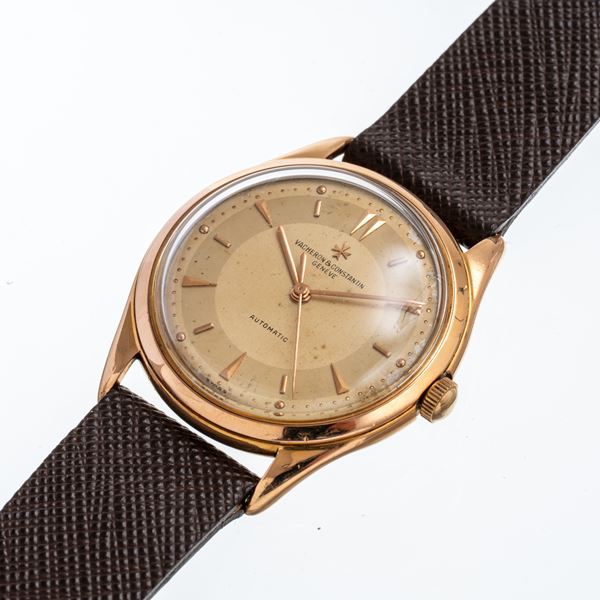 Notes: 18kt rose gold time watch with automatic winding. Bitonal dial. Indexes and balls to stick. Domed plexi glass. Screw back in 18kt rose gold.