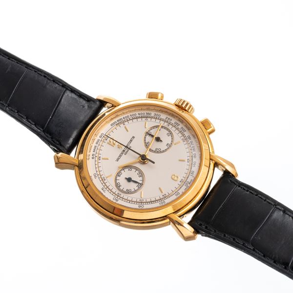 Notes: Manual winding chronograph in 18kt yellow gold. White dial with gold baton hour markers and Arabic numerals at 12 and 6 o'clock. Gold baton hands. Blue burnished chronograph hands. Vacheron Constantin leather strap, Vacheron Constantin 18kt yellow gold buckle. Domed mineral crystal. 18kt yellow gold push-in caseback.