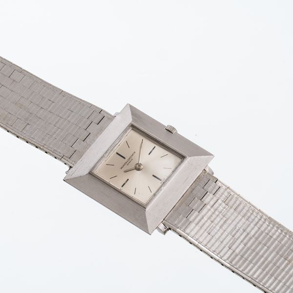Notes: Watch with square 'step' case in 18kt white gold, Gay Freres 'Brick in 18kt white gold' removable bracelet, overall length 18.5 cm. Stick hour markers and hands, white gold hour markers at three, six, nine and twelve o'clock. Flat mineral crystal, snap-in case back.